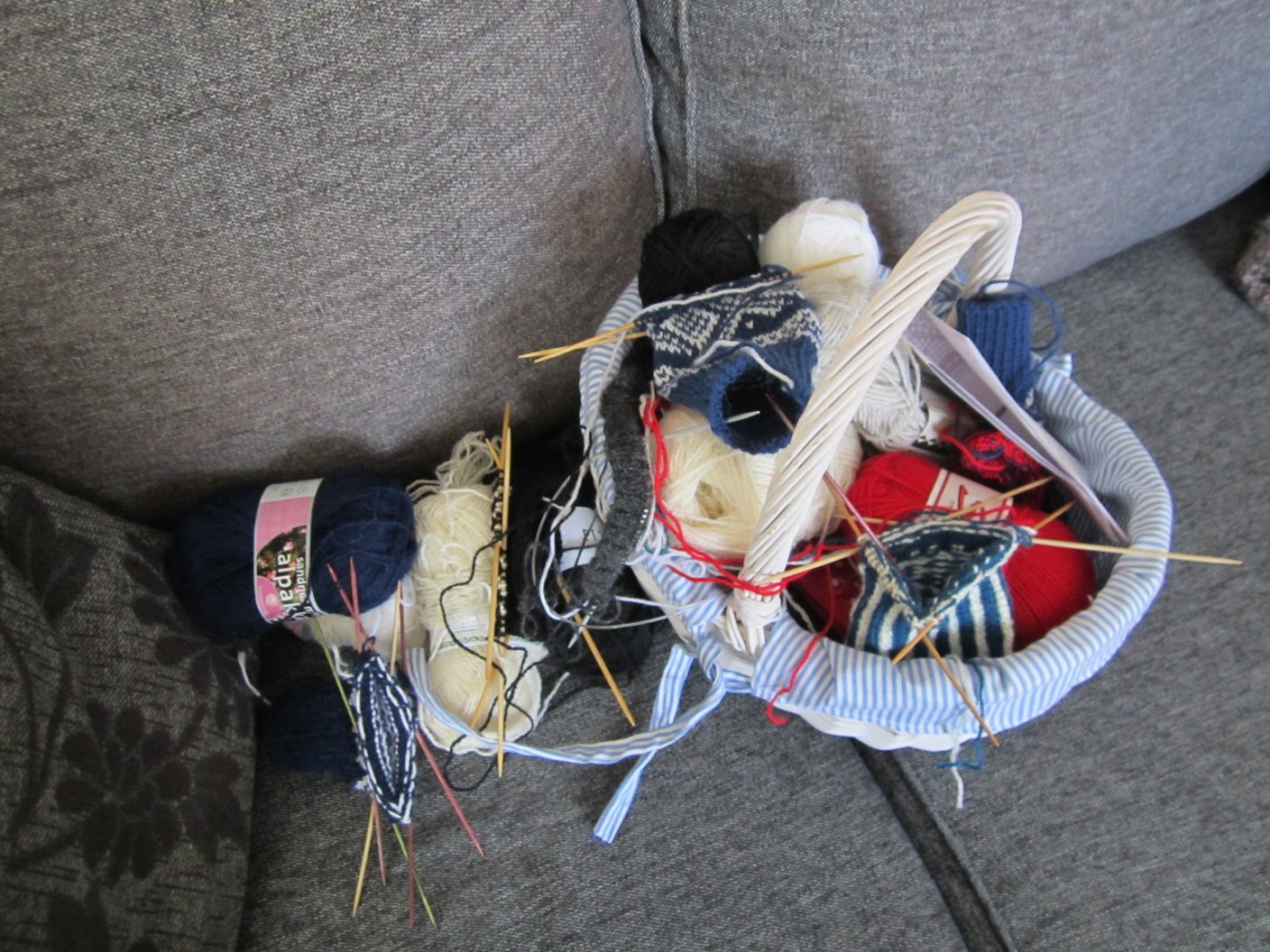 Jeg liker best å bare ha et strikketøy av gangen og gjøre det ferdig. Men hvis det er et mønster som krever konsentrasjon, har jeg som oftest et enklere ved siden av. Men nå hadde jeg mistet helt oversikten og det var blitt kaos i strikkekurven. Ikke nok med at det var blitt mange påbegynte strikketøy, nøstene hadde også surret seg sammen. Så igår var det bare å sette igang å få orden på sakene.